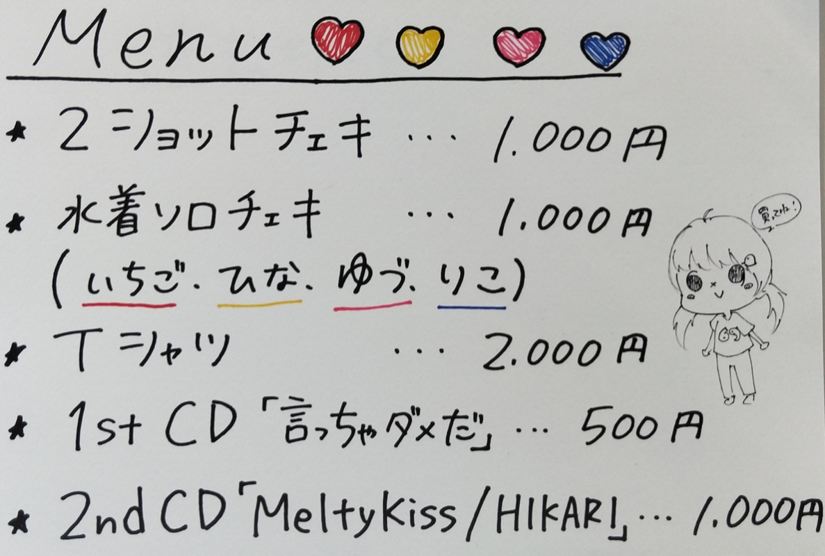 | 物販 | ・2ショットチェキ:1000円 ・Tシャツ(Mのみ):2000円 ・1stシングル「言っちゃダメだ」:500円 ・2ndシングル「Melty Kiss/HIKARI」:1000円 ・シークレットソロチェキ:1000円 |